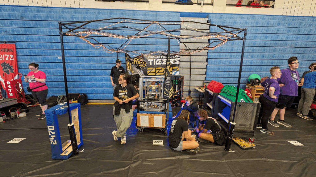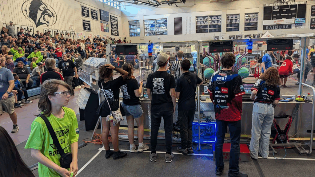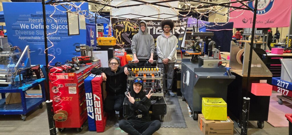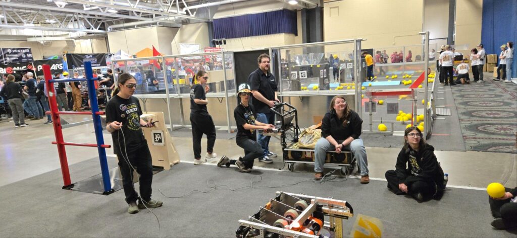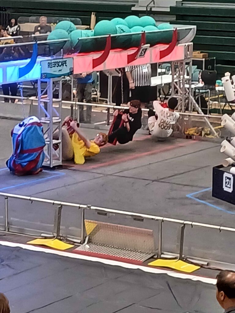 Pit set-up first thing in the morning led by Eli. After setting up, our scouters, Sal and Peyton, split up and started talking to other teams. Meanwhile, our drive team (Remi, Skyler, and Logan) were discussing how to strategize with other teams and getting ready for practice matches. We had 4 practice matches, winning the first two and losing the second two. Victoria and ThuyVi were our coaches and media personnel, switching positions each match throughout the competition.