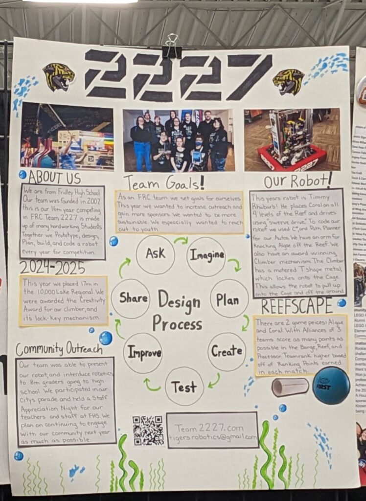 Another highlight of the event was our custom-designed poster, which shared our team’s goals, values, and impact in the community. We put a lot of thought into telling our story about how we build more than just robots. We’re building leadership, collaboration, and outreach. We were proud (and a little stunned!) to learn that our poster won second place overall. It was a great reminder that our work off the field matters just as much as what we build for competition.